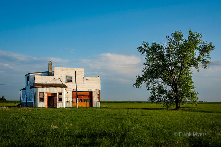 A derelict grain elevator with old trucks in rural Saskatchewan.